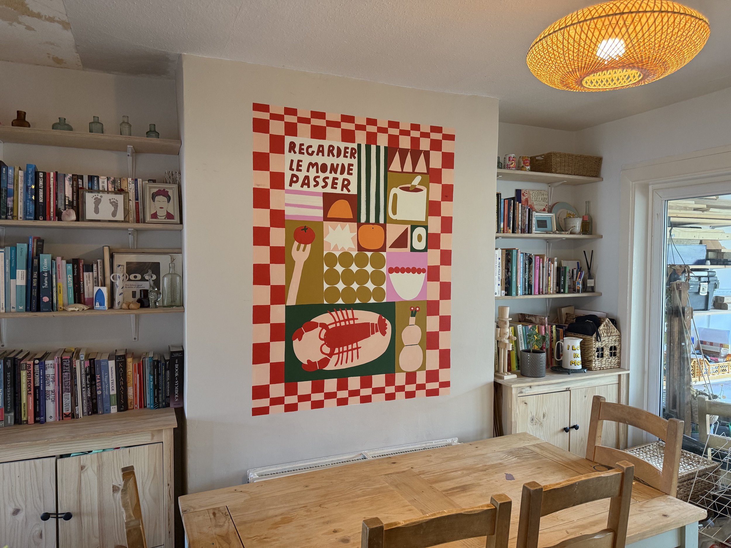 A first-time homeowner wanted something bespoke to complete their space. They shared a love of warm terracotta tones, French food culture and (brilliantly) lobsters. The mural was designed to sit perfectly above the dining table, framed by the chimney breast. It now anchors the entire room.