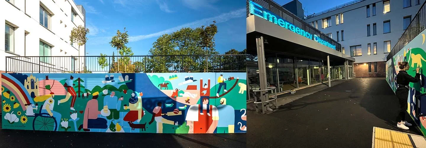 I worked closely with hospital staff to develop a mural reflecting both the local area and the diverse population using the hospital. The process included consultation, revisions and clear sign-off stages. The mural was so well received I was invited back to paint a second wall.