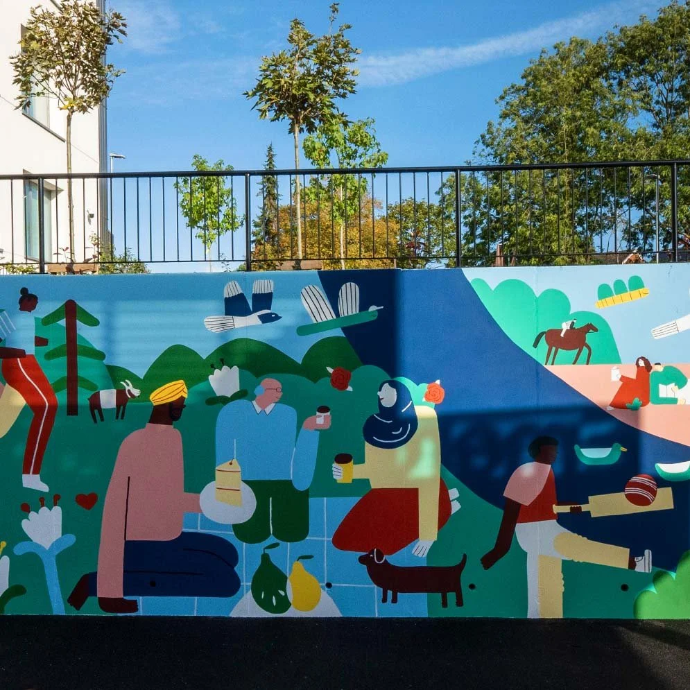 In Autumn 2024 Worcestershire Royal Hospital opened their brand new A&E department. The building was under construction when I was invited to paint the 12m x 2m concrete wall that surrounded the entrance to the new department. As part of the design process I led participants from the staff forums through some idea generation workshops. The final design is a celebration of the local countryside with nods to Worcestershire’s landscape. Hidden amongst the characters are icons that represent ideas from workshop participants. Many of the staff have migrated to the UK or live in other cities so we wanted to make sure their voices were represented too. The wall was so well received that I was invited back in 2025 to paint a second wall (the mural made all the surrounding walls look worse until they were painted as well!)